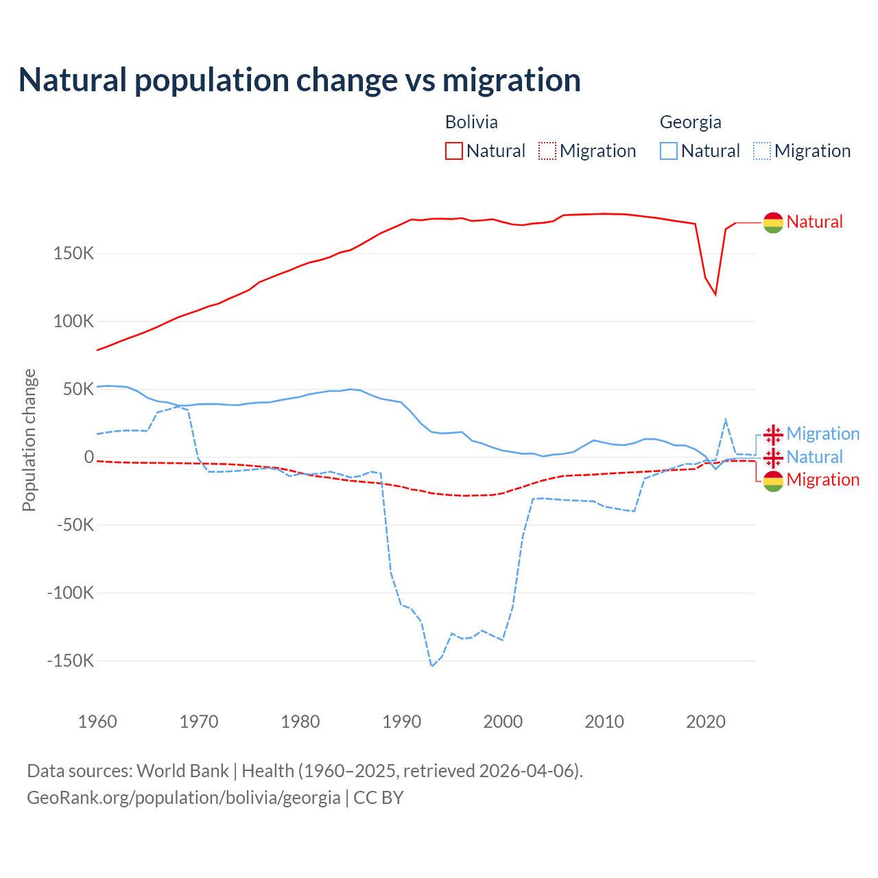 Over the last 10 years, 95.6% of the population change in Bolivia is from natural causes (a gain of 1,637,833 people) and 4.37% is from migration (a loss of 74,903 people). In Georgia 57.7% is from natural causes (a gain of 47,646 people) and 42.3% is from migration (a loss of 34,907 people).
