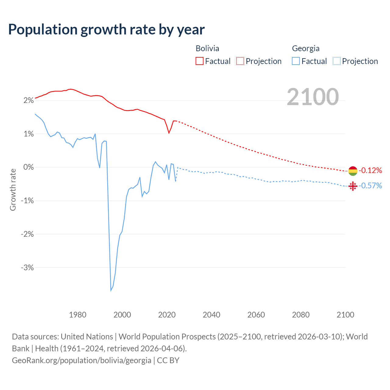 - For the last 10 years, Bolivia has had an average growth rate of +1.37% per year vs -0.04% in Georgia.