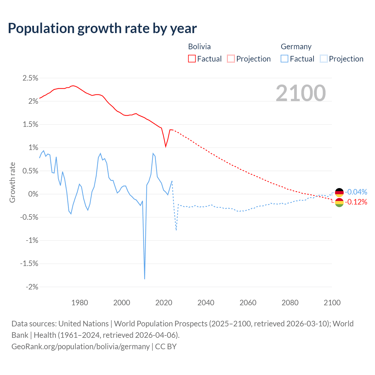 - For the last 10 years, Bolivia has had an average growth rate of +1.37% per year vs +0.32% in Germany.