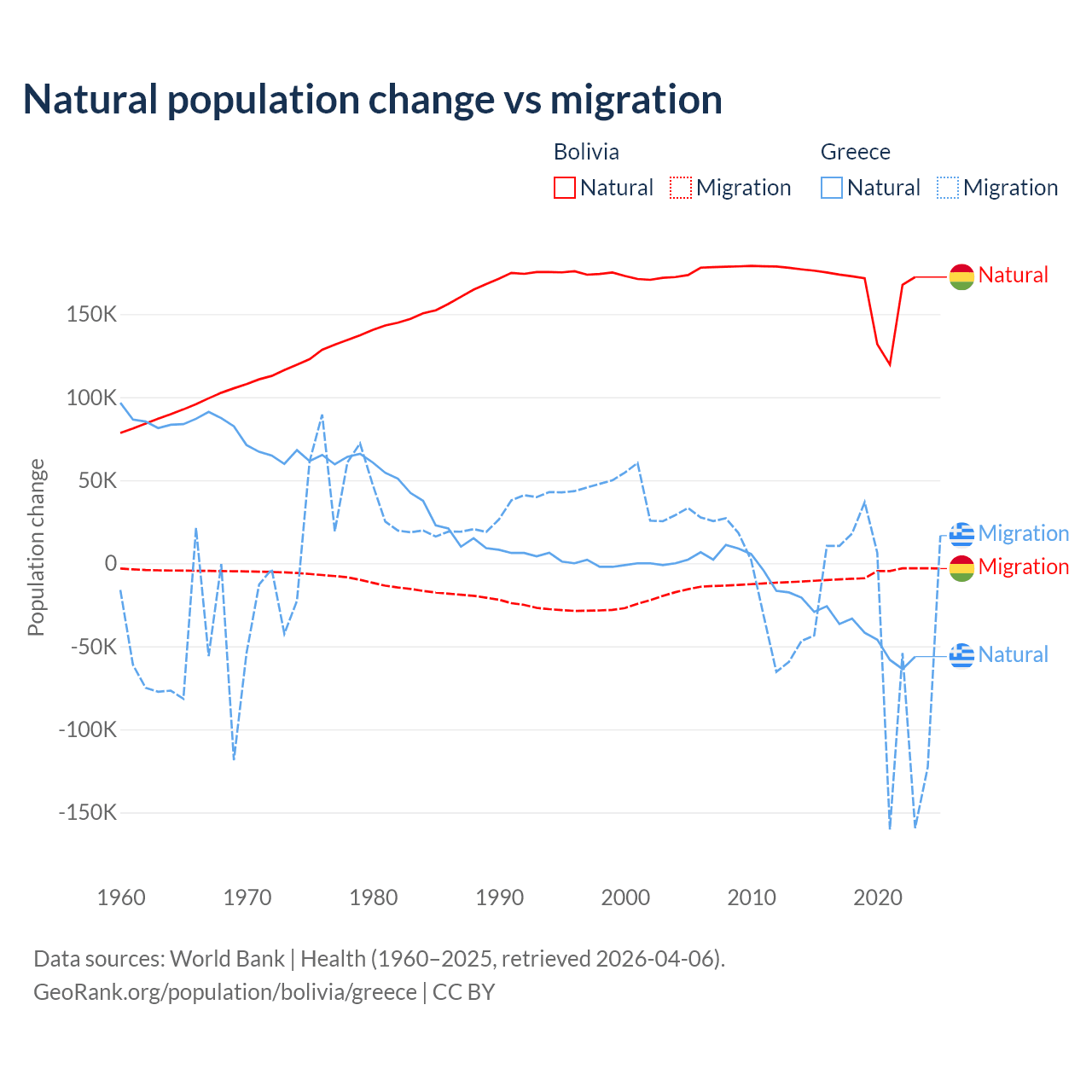 Over the last 10 years, 95.6% of the population change in Bolivia is from natural causes (a gain of 1,637,833 people) and 4.37% is from migration (a loss of 74,903 people). In Greece 51.9% is from natural causes (a loss of 411,426 people) and 48.1% is from migration (a loss of 381,824 people).