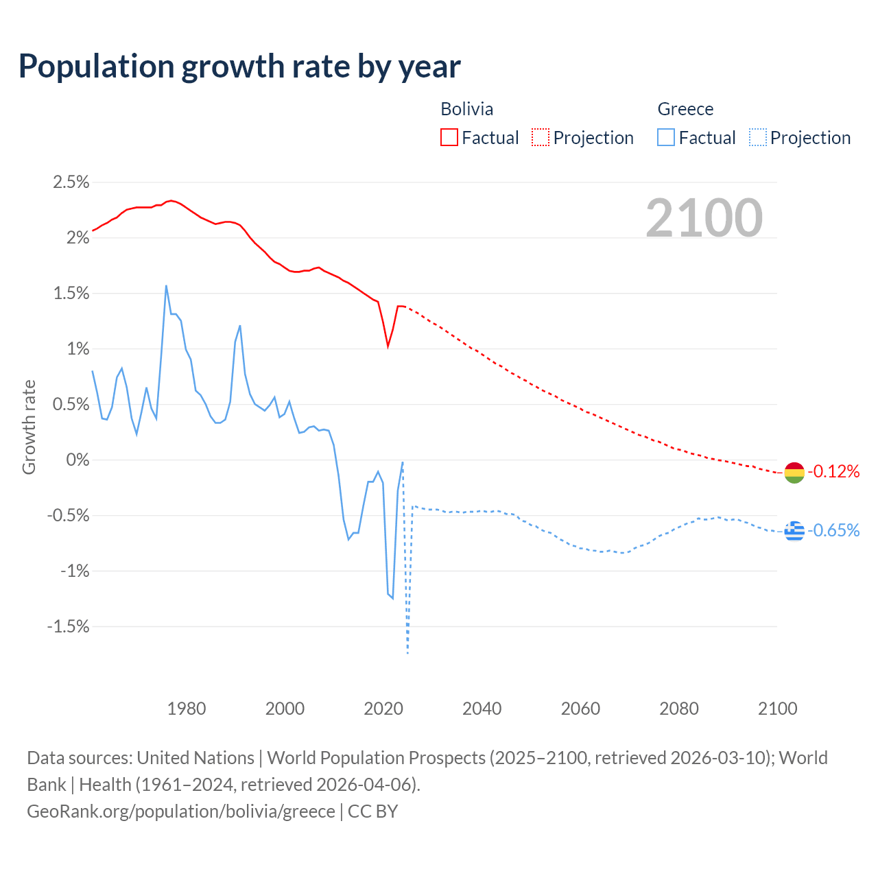 Data sources: World Bank | Health (1960–2024, retrieved 2026-04-06); United Nations | World Population Prospects (1960–2026, retrieved 2026-03-10); U.S. Census Bureau (1960–2025, retrieved 2026-02-08); Central Intelligence Agency (CIA) (2000–2019, retrieved 2026-02-20).