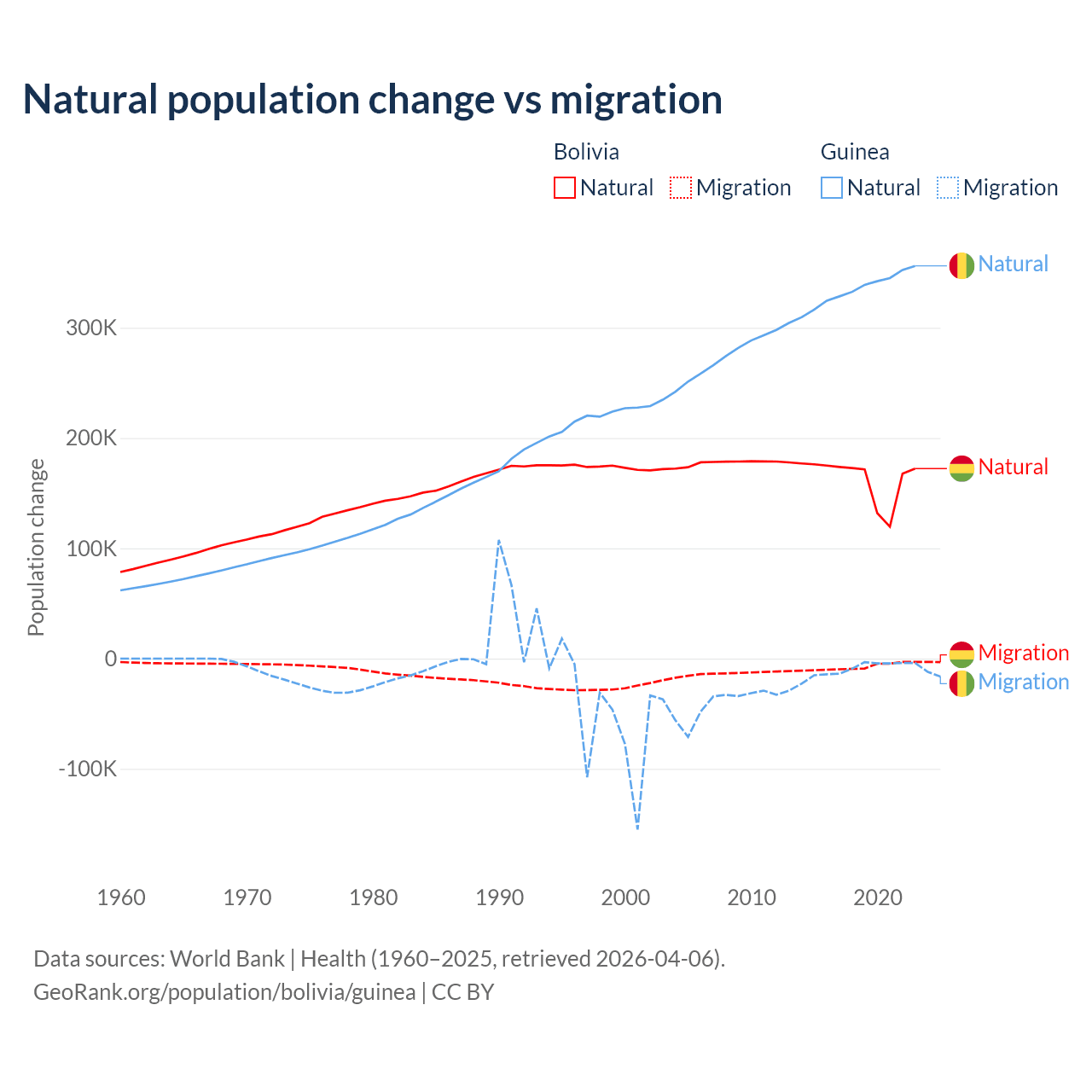 Over the last 10 years, 95.6% of the population change in Bolivia is from natural causes (a gain of 1,637,833 people) and 4.37% is from migration (a loss of 74,903 people). In Guinea 97.2% is from natural causes (a gain of 3,346,936 people) and 2.76% is from migration (a loss of 94,924 people).