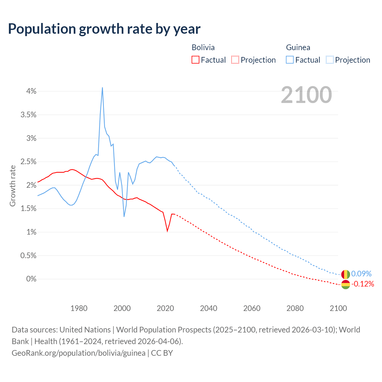 - For the last 10 years, Bolivia has had an average growth rate of +1.37% per year vs +2.54% in Guinea.