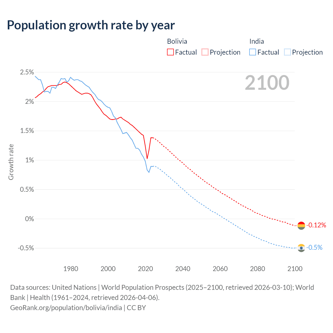- For the last 10 years, Bolivia has had an average growth rate of +1.37% per year vs +1.03% in India.
