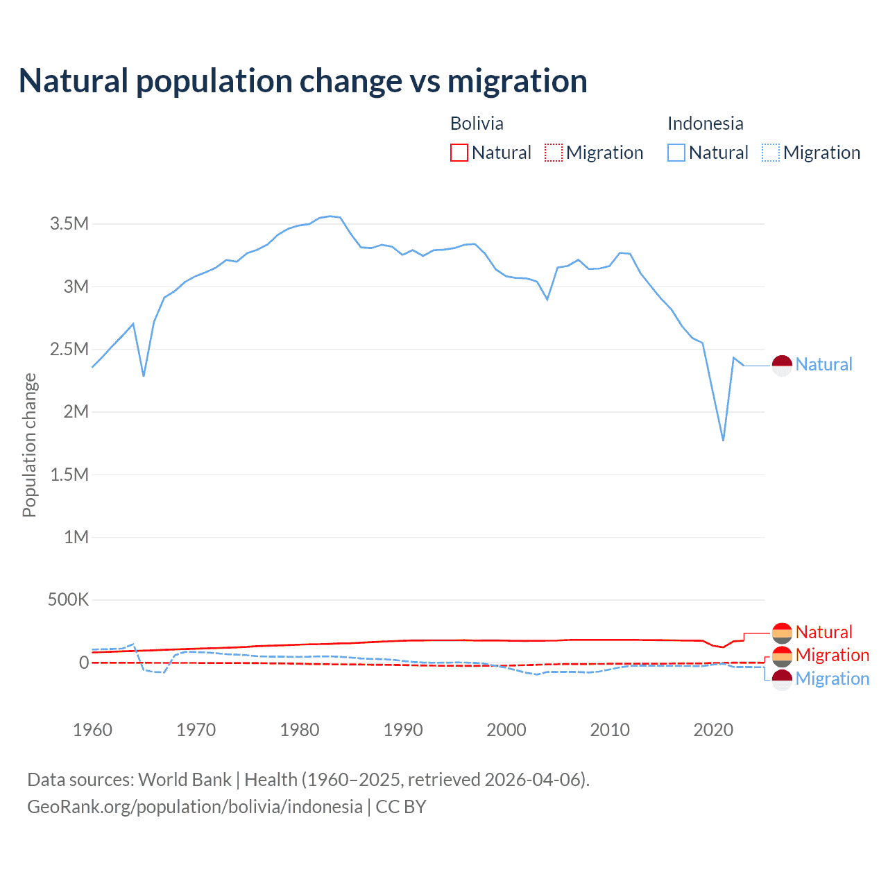 Over the last 10 years, 95.6% of the population change in Bolivia is from natural causes (a gain of 1,637,833 people) and 4.37% is from migration (a loss of 74,903 people). In Indonesia 98.9% is from natural causes (a gain of 25,242,860 people) and 1.1% is from migration (a loss of 280,258 people).