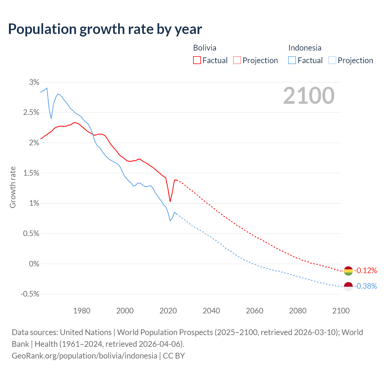 Data sources: World Bank | Health (1960–2024, retrieved 2026-04-06); United Nations | World Population Prospects (1960–2026, retrieved 2026-03-10); U.S. Census Bureau (1960–2025, retrieved 2026-02-08); Central Intelligence Agency (CIA) (2000–2019, retrieved 2026-02-20).