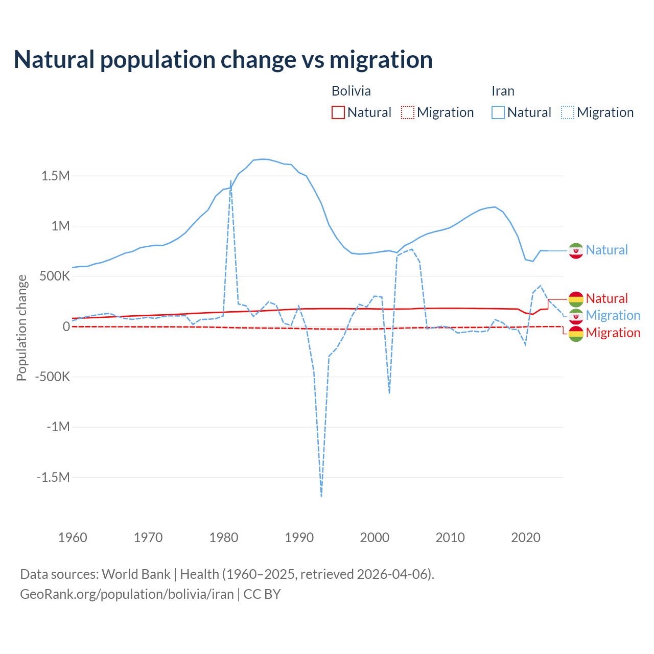 Over the last 10 years, 95.6% of the population change in Bolivia is from natural causes (a gain of 1,637,833 people) and 4.37% is from migration (a loss of 74,903 people). In Iran 92.5% is from natural causes (a gain of 9,405,860 people) and 7.46% is from migration (a gain of 757,979 people).
