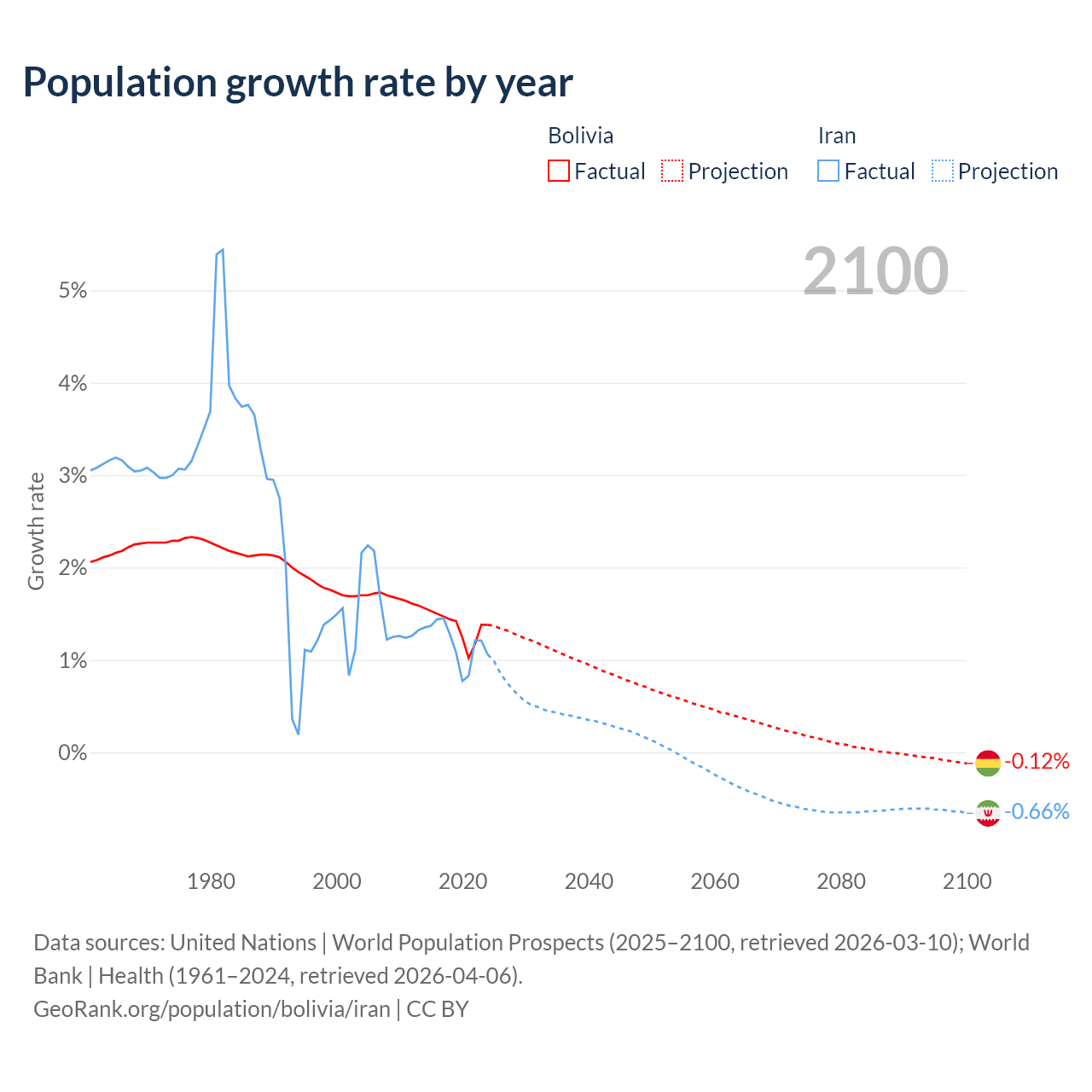 - For the last 10 years, Bolivia has had an average growth rate of +1.37% per year vs +1.19% in Iran.