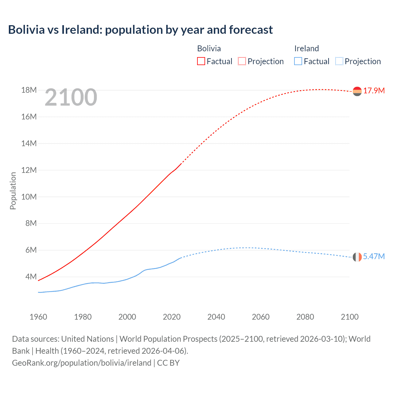 Bolivia vs Ireland: population by year and forecast