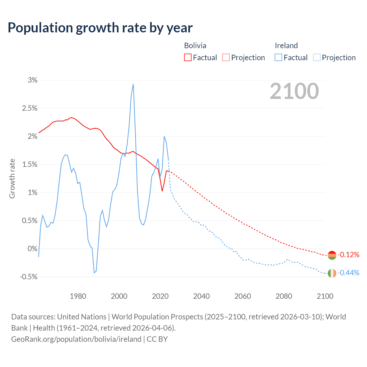 - For the last 10 years, Bolivia has had an average growth rate of +1.37% per year vs +1.41% in Ireland.