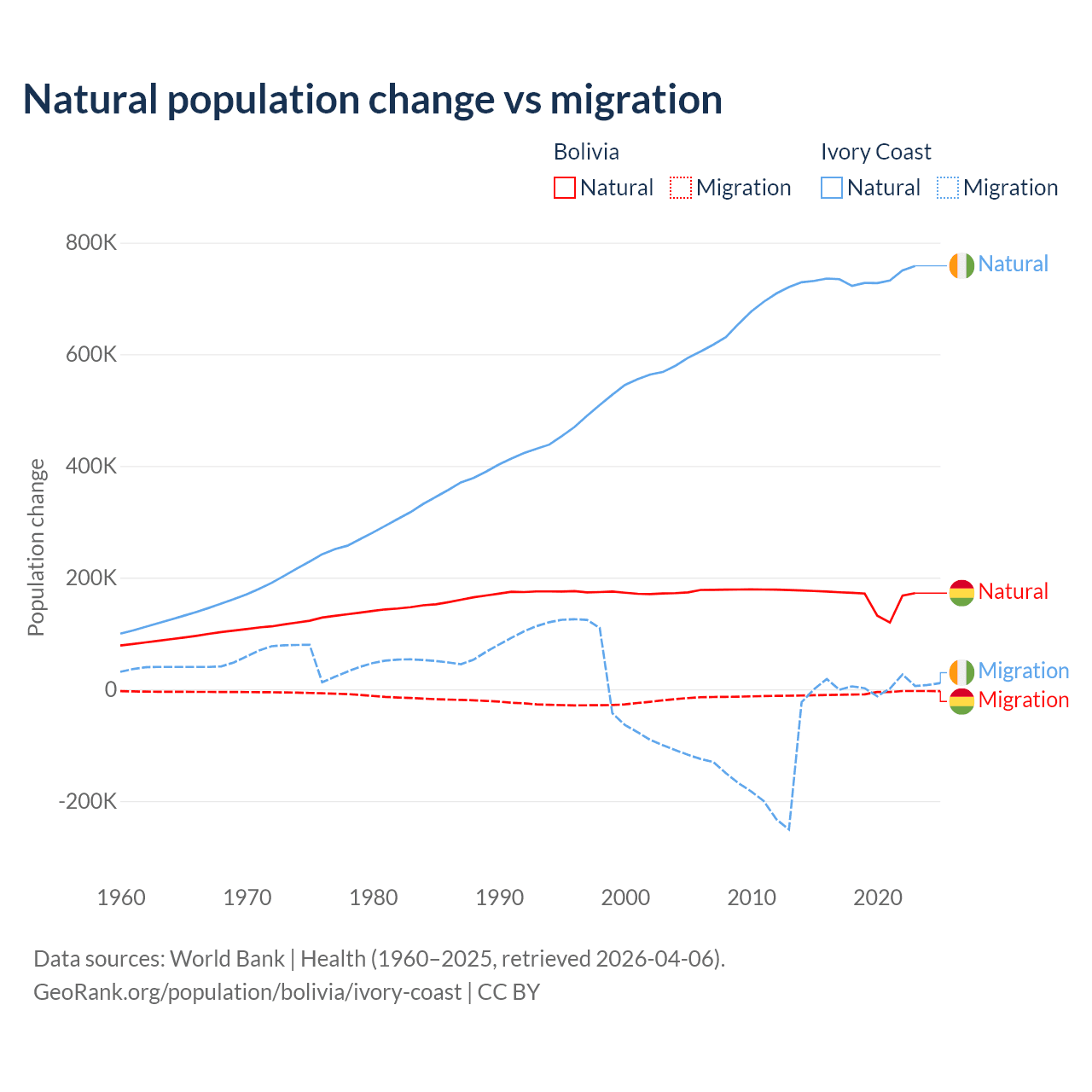 Over the last 10 years, 95.6% of the population change in Bolivia is from natural causes (a gain of 1,637,833 people) and 4.37% is from migration (a loss of 74,903 people). In Ivory Coast 99.7% is from natural causes (a gain of 7,348,944 people) and 0.33% is from migration (a gain of 24,432 people).