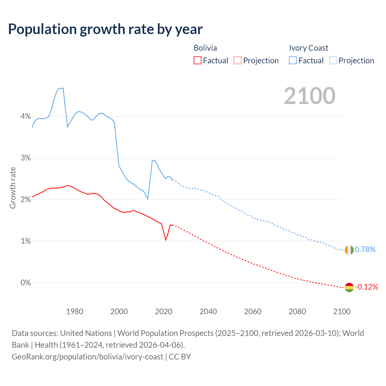 - For the last 10 years, Bolivia has had an average growth rate of +1.37% per year vs +2.65% in Ivory Coast.