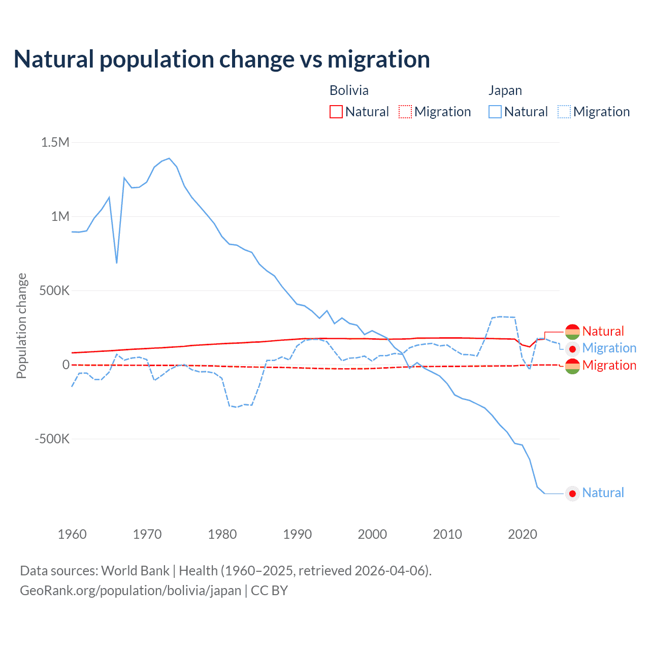 Over the last 10 years, 95.6% of the population change in Bolivia is from natural causes (a gain of 1,637,833 people) and 4.37% is from migration (a loss of 74,903 people). In Japan 73.6% is from natural causes (a loss of 5,178,838 people) and 26.4% is from migration (a gain of 1,860,103 people).