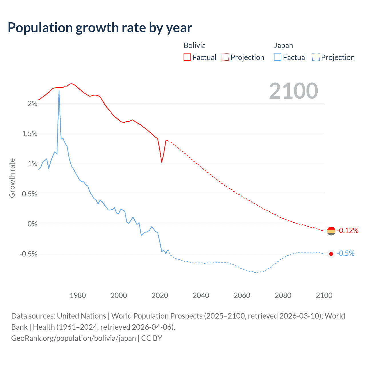 - For the last 10 years, Bolivia has had an average growth rate of +1.37% per year vs -0.25% in Japan.
