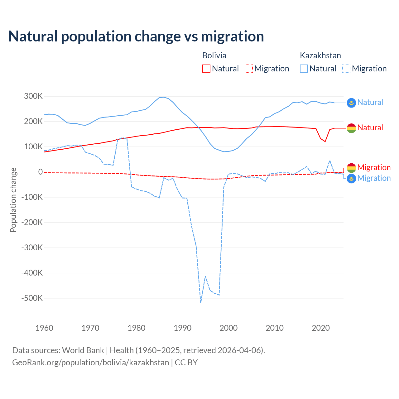 Over the last 10 years, 95.6% of the population change in Bolivia is from natural causes (a gain of 1,637,833 people) and 4.37% is from migration (a loss of 74,903 people). In Kazakhstan 98.7% is from natural causes (a gain of 2,743,094 people) and 1.33% is from migration (a gain of 36,908 people).