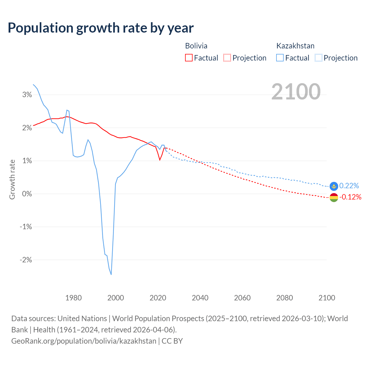 - For the last 10 years, Bolivia has had an average growth rate of +1.37% per year vs +1.46% in Kazakhstan.