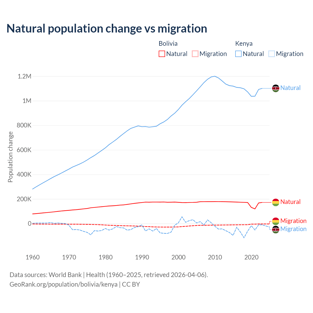 Over the last 10 years, 95.6% of the population change in Bolivia is from natural causes (a gain of 1,637,833 people) and 4.37% is from migration (a loss of 74,903 people). In Kenya 95.3% is from natural causes (a gain of 10,892,362 people) and 4.67% is from migration (a loss of 533,876 people).