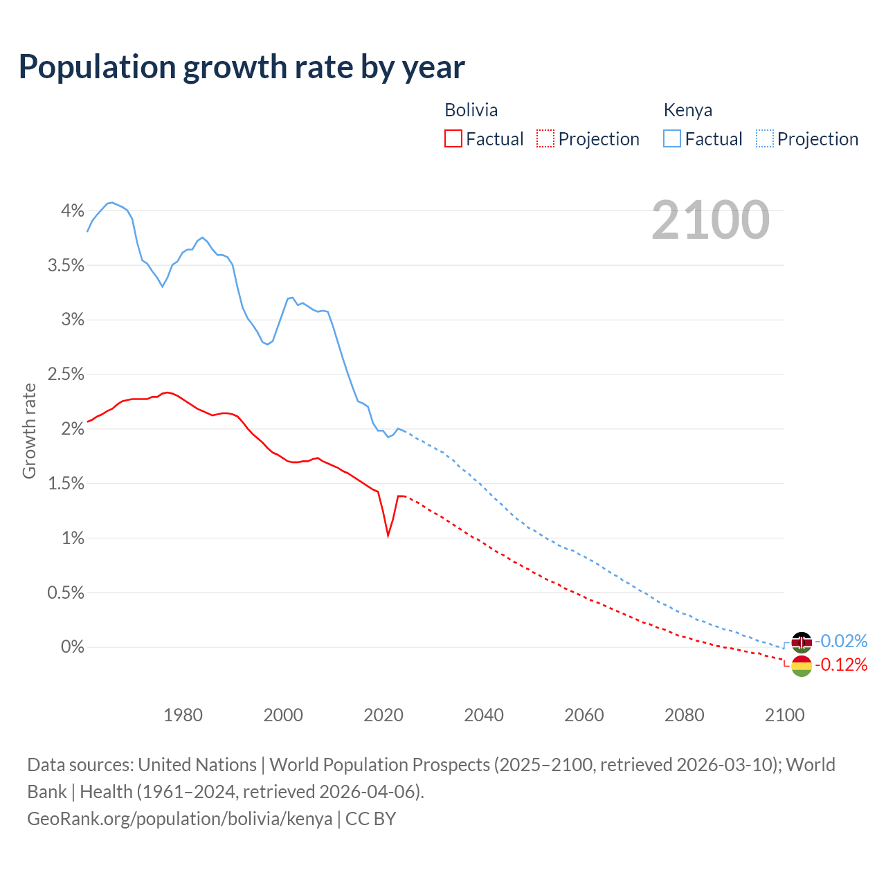 Data sources: World Bank | Health (1960–2024, retrieved 2026-04-06); United Nations | World Population Prospects (1960–2026, retrieved 2026-03-10); U.S. Census Bureau (1960–2025, retrieved 2026-02-08); Central Intelligence Agency (CIA) (2000–2019, retrieved 2026-02-20).