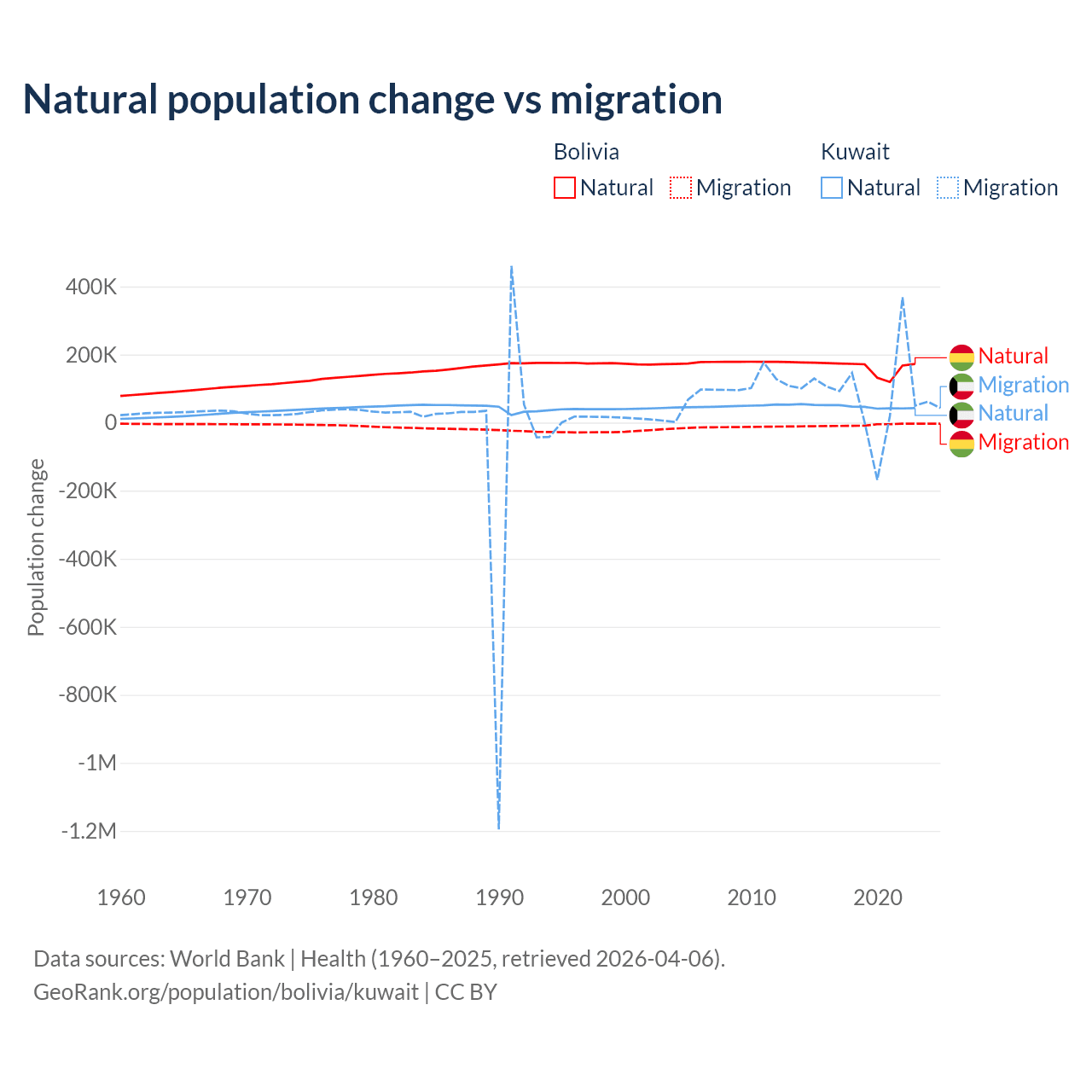 Over the last 10 years, 95.6% of the population change in Bolivia is from natural causes (a gain of 1,637,833 people) and 4.37% is from migration (a loss of 74,903 people). In Kuwait 35.8% is from natural causes (a gain of 470,645 people) and 64.2% is from migration (a gain of 845,142 people).