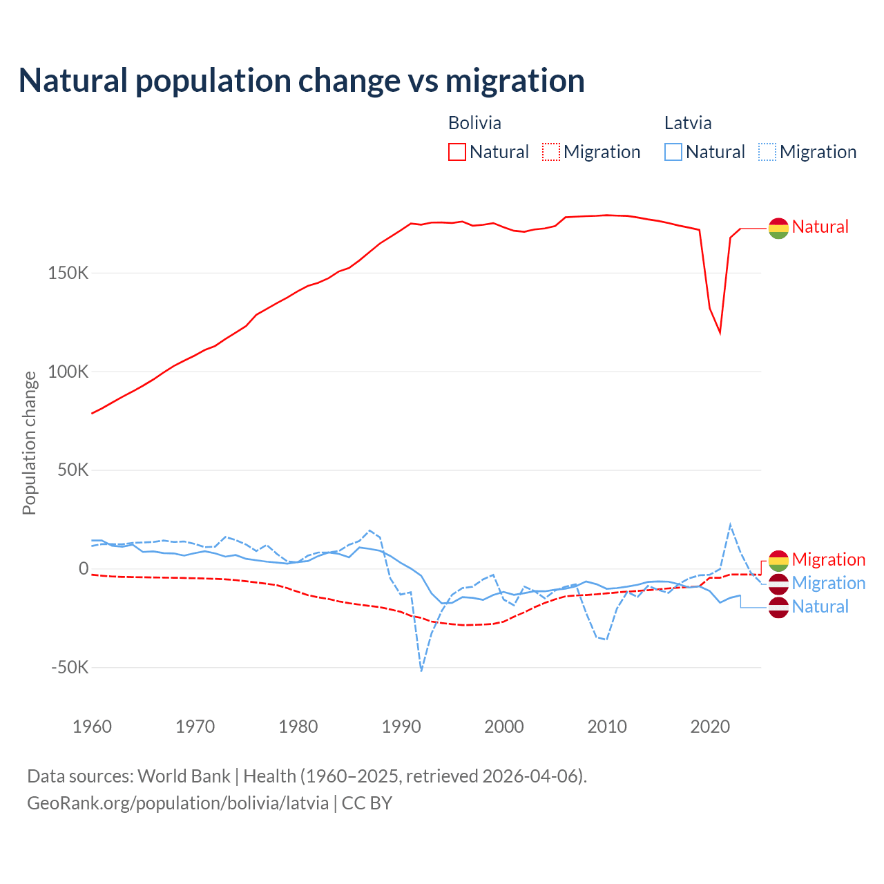 Over the last 10 years, 95.6% of the population change in Bolivia is from natural causes (a gain of 1,637,833 people) and 4.37% is from migration (a loss of 74,903 people). In Latvia 82.7% is from natural causes (a loss of 103,711 people) and 17.3% is from migration (a loss of 21,641 people).