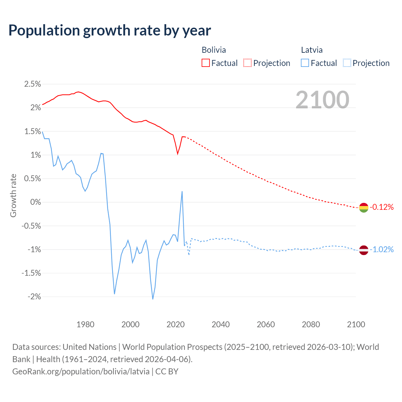 - For the last 10 years, Bolivia has had an average growth rate of +1.37% per year vs -0.68% in Latvia.