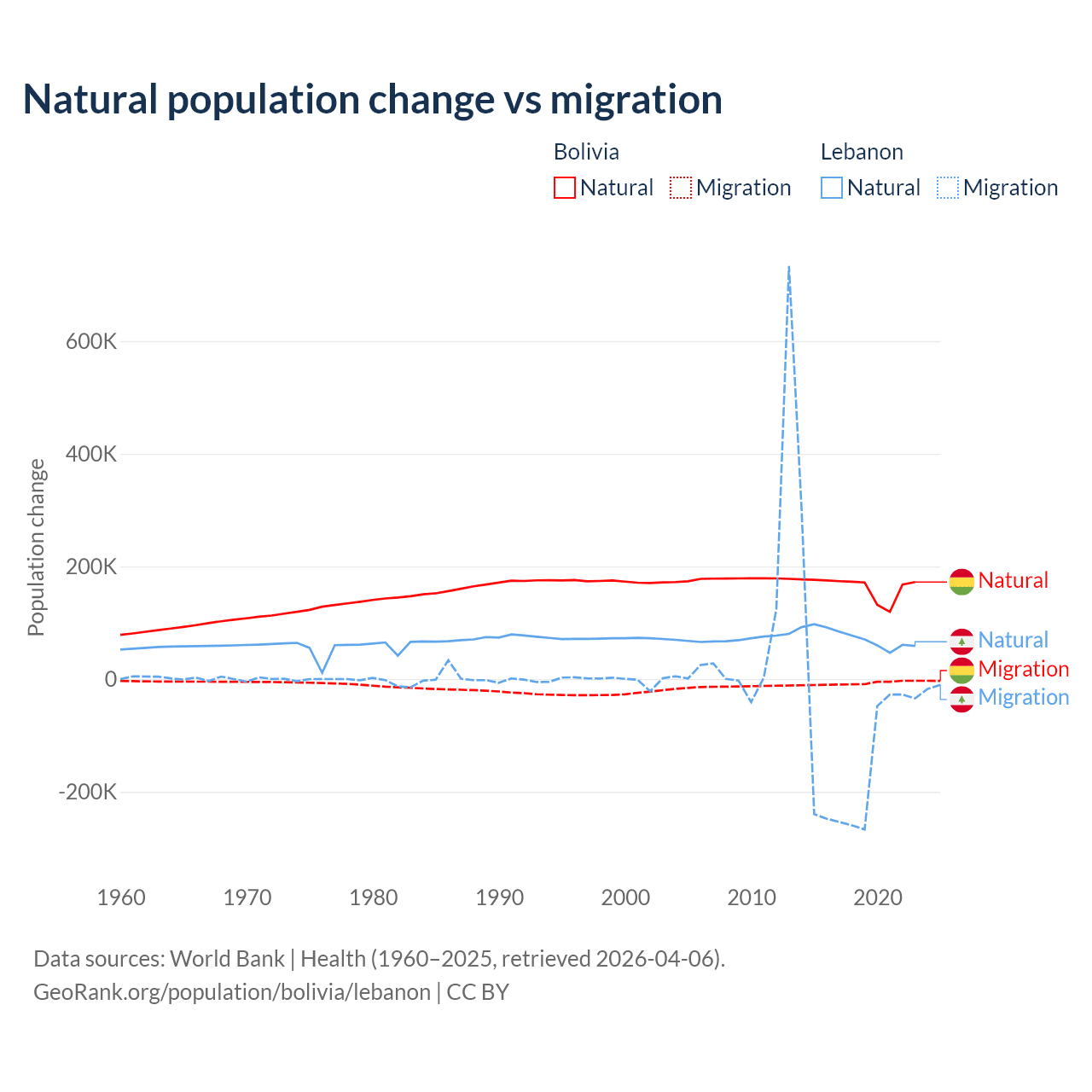 Over the last 10 years, 95.6% of the population change in Bolivia is from natural causes (a gain of 1,637,833 people) and 4.37% is from migration (a loss of 74,903 people). In Lebanon 40.1% is from natural causes (a gain of 739,256 people) and 59.9% is from migration (a loss of 1,103,772 people).
