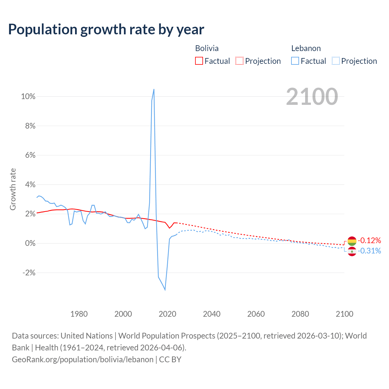 - For the last 10 years, Bolivia has had an average growth rate of +1.37% per year vs +0.16% in Lebanon.