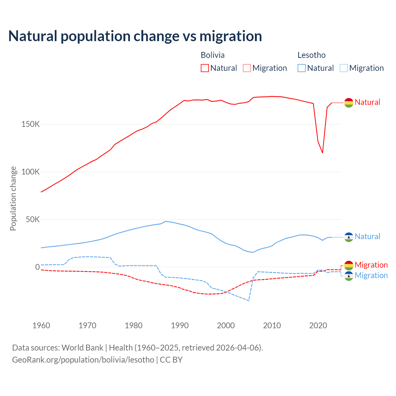 Over the last 10 years, 95.6% of the population change in Bolivia is from natural causes (a gain of 1,637,833 people) and 4.37% is from migration (a loss of 74,903 people). In Lesotho 84.2% is from natural causes (a gain of 315,836 people) and 15.8% is from migration (a loss of 59,457 people).