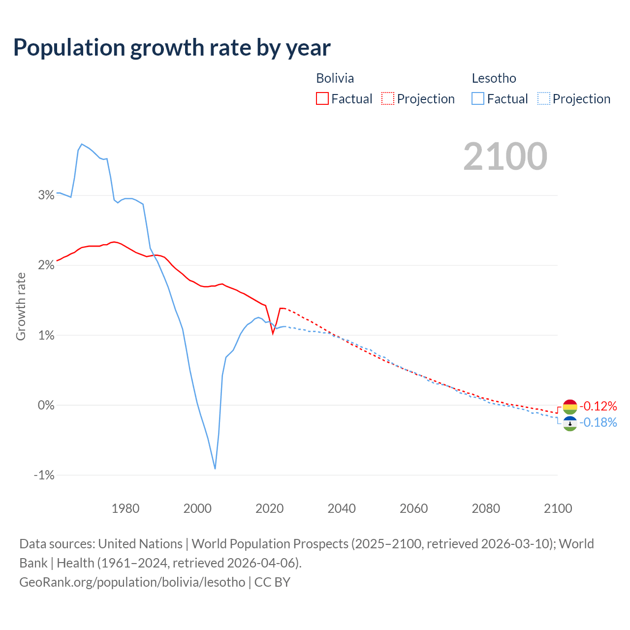 - For the last 10 years, Bolivia has had an average growth rate of +1.37% per year vs +1.17% in Lesotho.