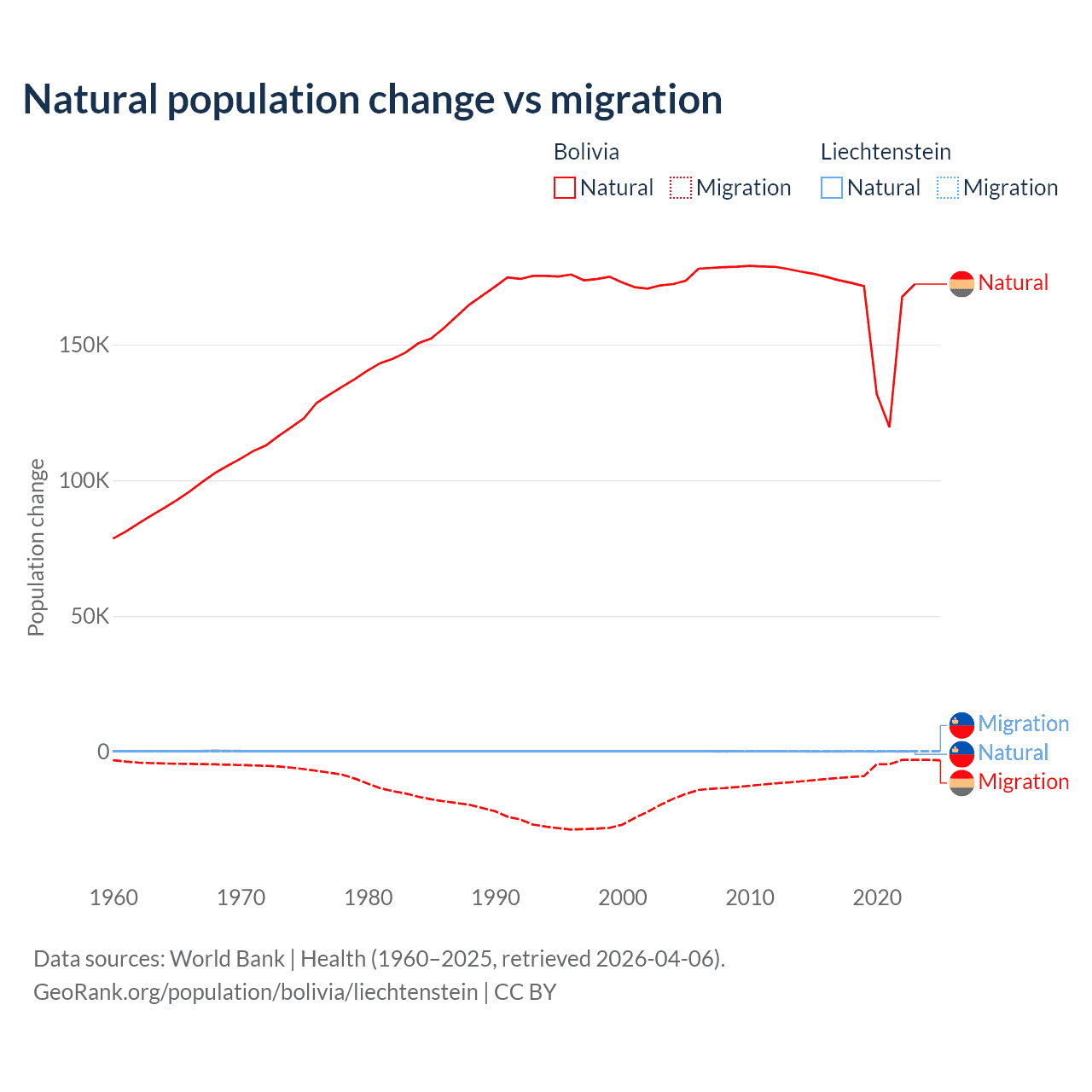 Over the last 10 years, 95.6% of the population change in Bolivia is from natural causes (a gain of 1,637,833 people) and 4.37% is from migration (a loss of 74,903 people). In Liechtenstein 32.4% is from natural causes (a gain of 883 people) and 67.6% is from migration (a gain of 1,843 people).