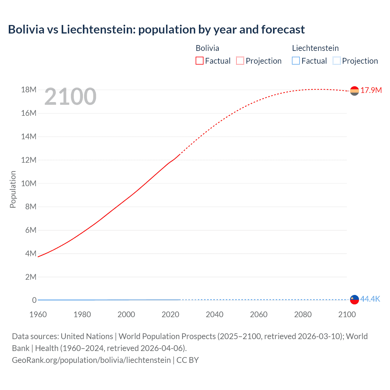 Bolivia vs Liechtenstein: population by year and forecast