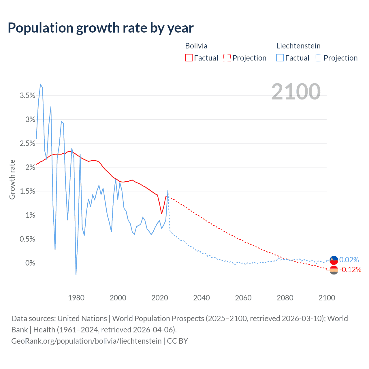 - For the last 10 years, Bolivia has had an average growth rate of +1.37% per year vs +0.82% in Liechtenstein.