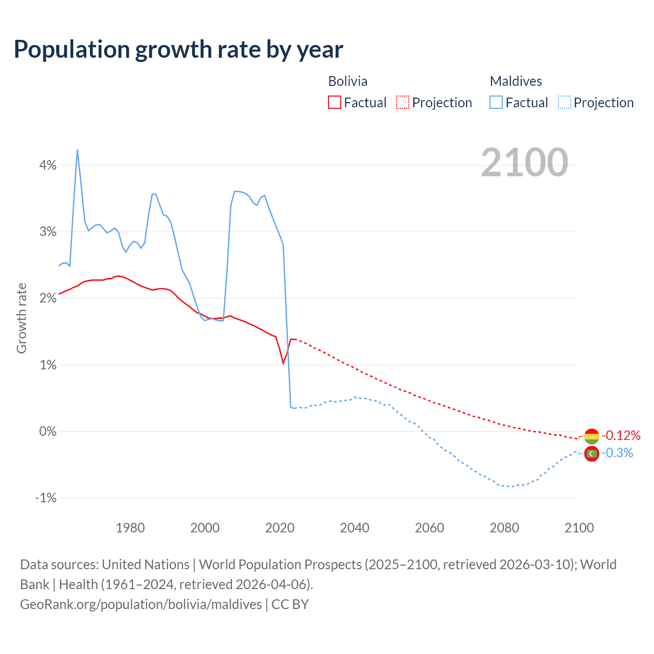 - For the last 10 years, Bolivia has had an average growth rate of +1.37% per year vs +2.56% in Maldives.