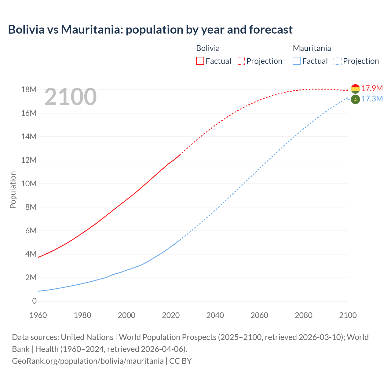 Bolivia vs Mauritania: population by year and forecast