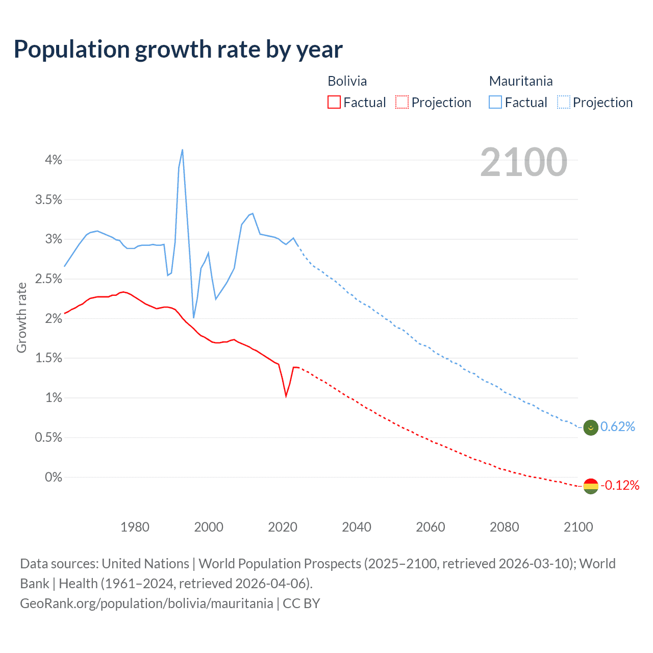 - For the last 10 years, Bolivia has had an average growth rate of +1.37% per year vs +3% in Mauritania.