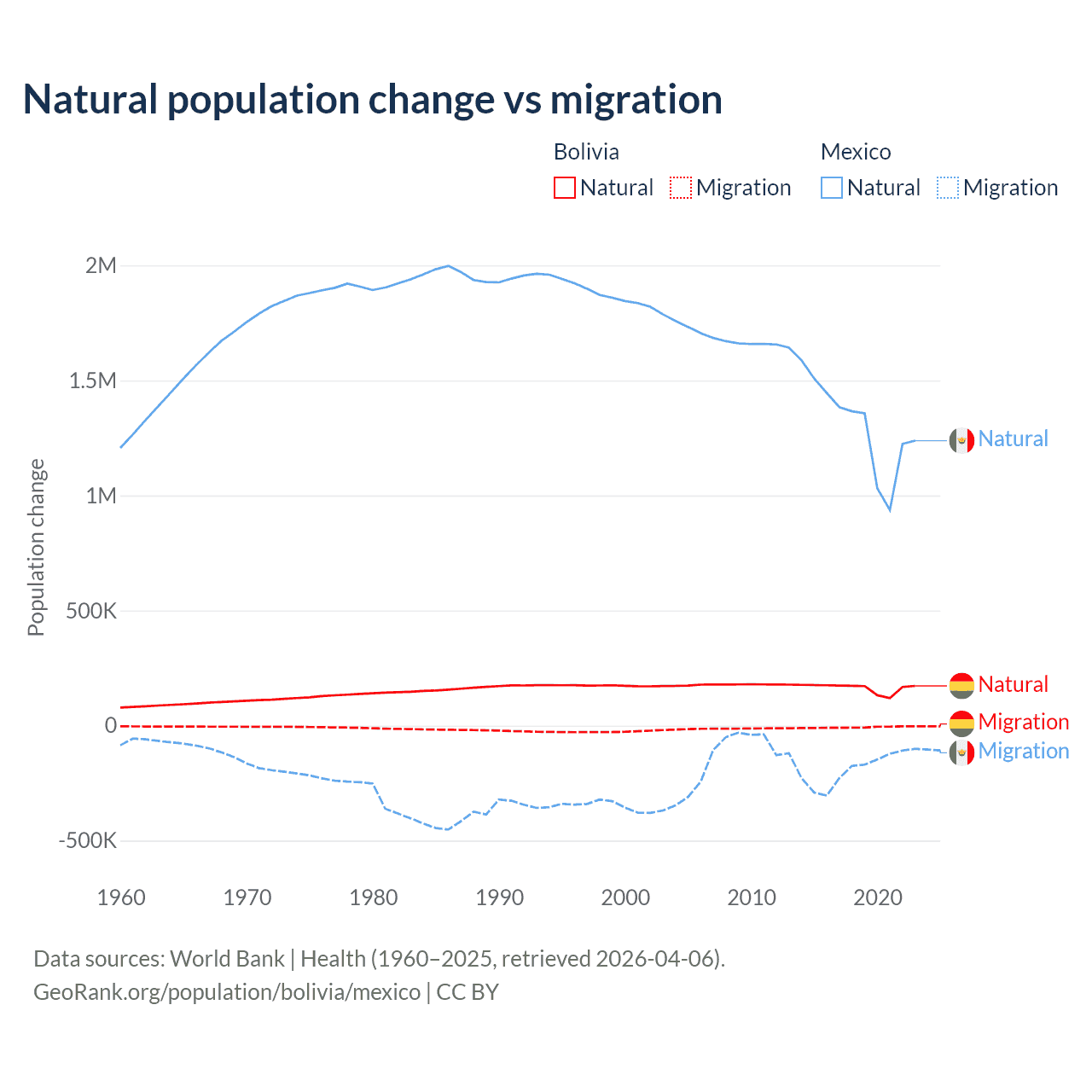 Over the last 10 years, 95.6% of the population change in Bolivia is from natural causes (a gain of 1,637,833 people) and 4.37% is from migration (a loss of 74,903 people). In Mexico 87.5% is from natural causes (a gain of 13,080,136 people) and 12.5% is from migration (a loss of 1,876,544 people).