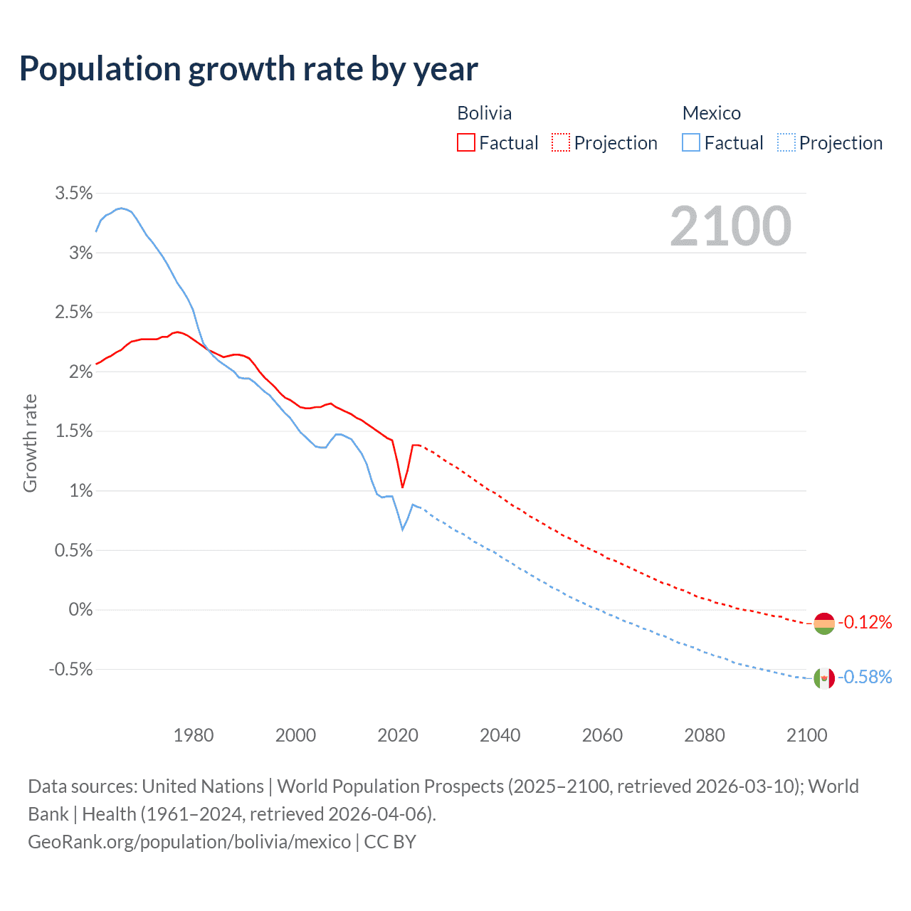 Data sources: World Bank | Health (1960–2024, retrieved 2026-04-06); United Nations | World Population Prospects (1960–2026, retrieved 2026-03-10); U.S. Census Bureau (1960–2025, retrieved 2026-02-08); Central Intelligence Agency (CIA) (2000–2019, retrieved 2026-02-20).