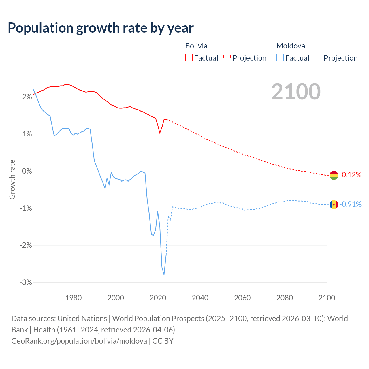 - For the last 10 years, Bolivia has had an average growth rate of +1.37% per year vs -1.57% in Moldova.