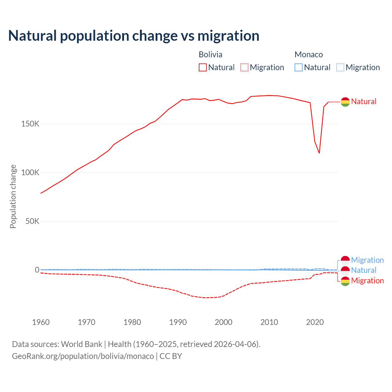 Over the last 10 years, 95.6% of the population change in Bolivia is from natural causes (a gain of 1,637,833 people) and 4.37% is from migration (a loss of 74,903 people). In Monaco 37.3% is from natural causes (a loss of 4,357 people) and 62.7% is from migration (a gain of 7,333 people).