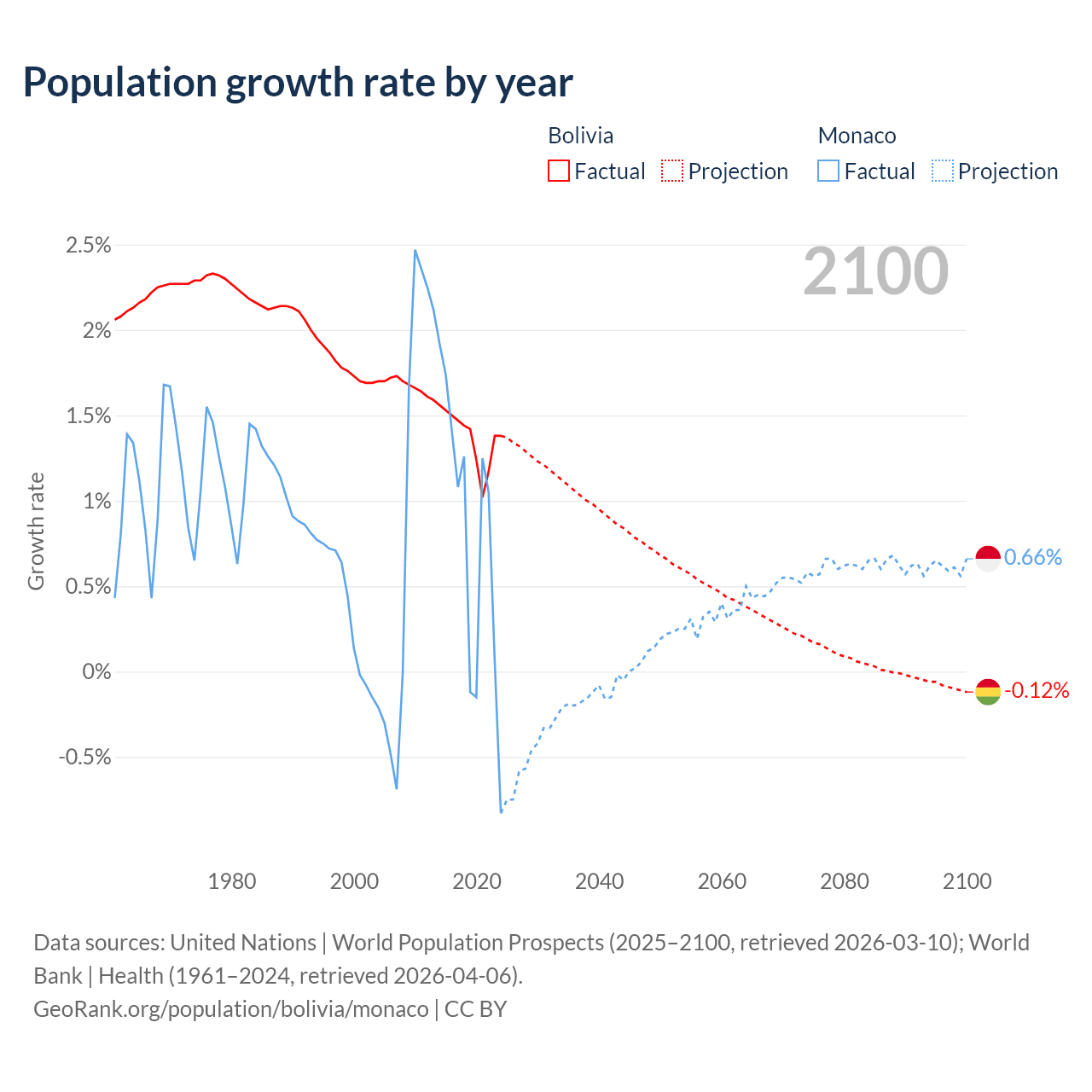 - For the last 10 years, Bolivia has had an average growth rate of +1.37% per year vs +0.79% in Monaco.