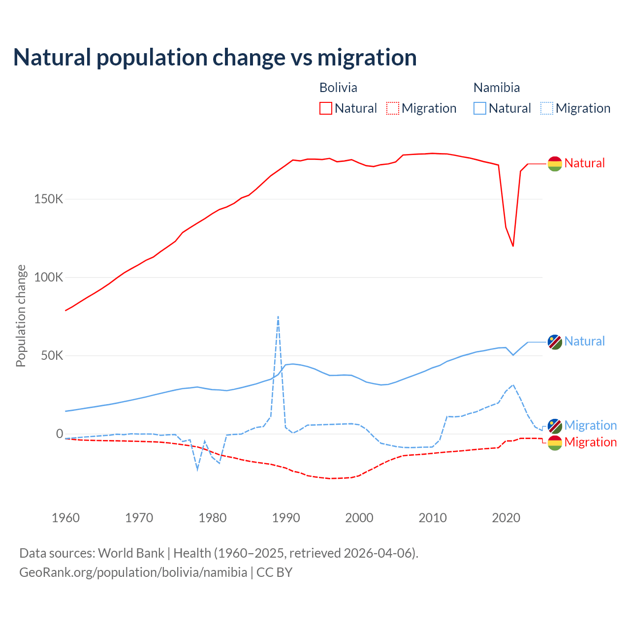 Over the last 10 years, 95.6% of the population change in Bolivia is from natural causes (a gain of 1,637,833 people) and 4.37% is from migration (a loss of 74,903 people). In Namibia 74.3% is from natural causes (a gain of 532,532 people) and 25.7% is from migration (a gain of 183,837 people).