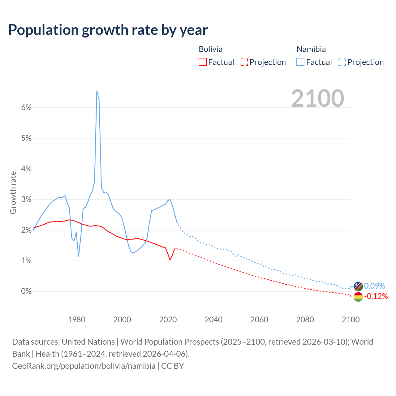Data sources: World Bank | Health (1960–2024, retrieved 2026-04-06); United Nations | World Population Prospects (1960–2026, retrieved 2026-03-10); U.S. Census Bureau (1960–2025, retrieved 2026-02-08); Central Intelligence Agency (CIA) (2000–2019, retrieved 2026-02-20).