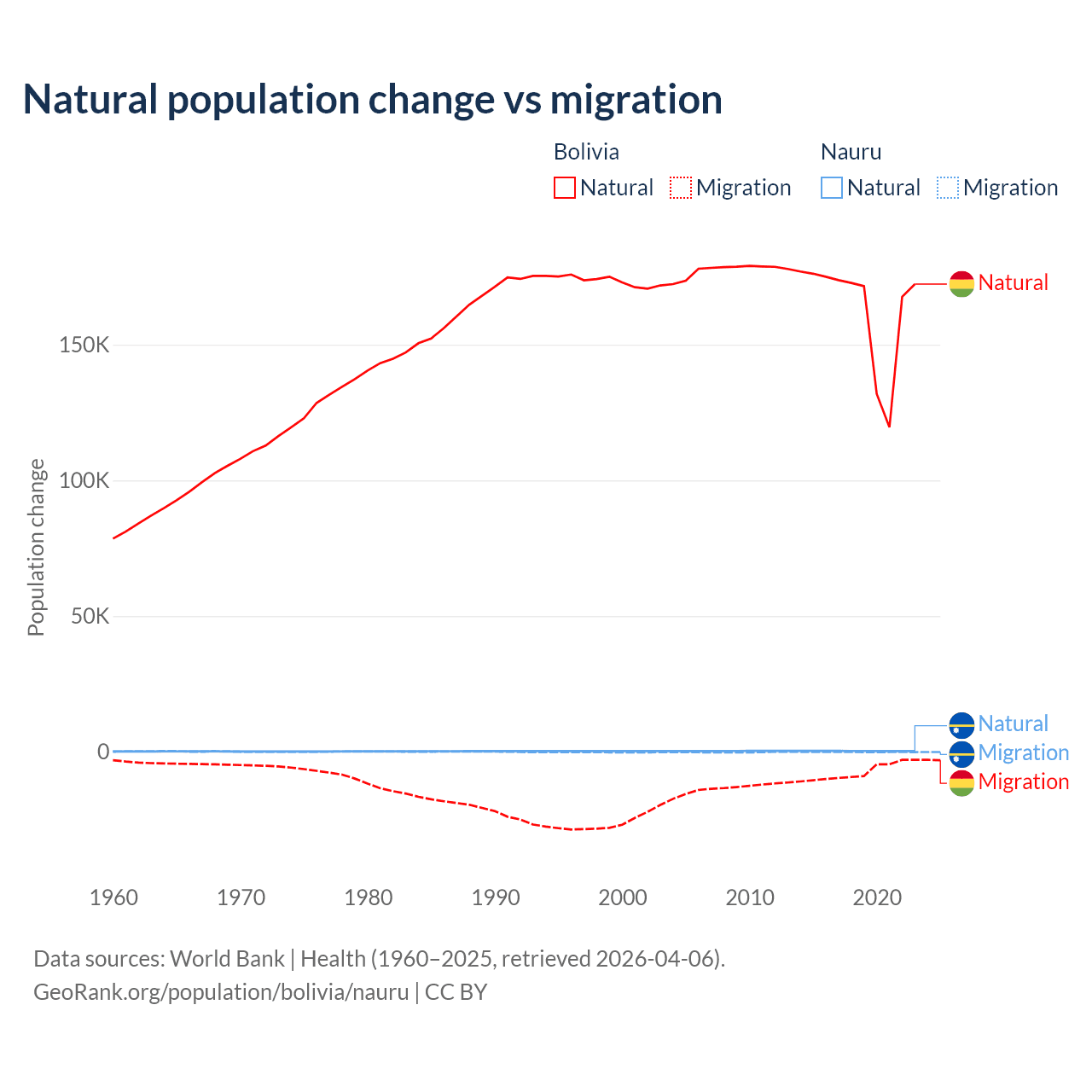 Over the last 10 years, 95.6% of the population change in Bolivia is from natural causes (a gain of 1,637,833 people) and 4.37% is from migration (a loss of 74,903 people). In Nauru 66.2% is from natural causes (a gain of 2,590 people) and 33.8% is from migration (a loss of 1,320 people).