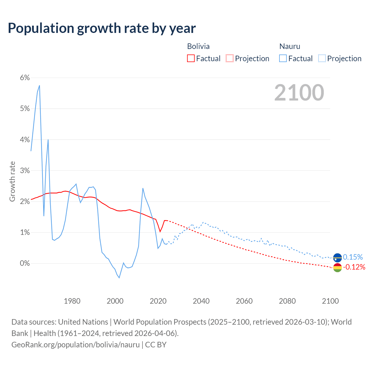 - For the last 10 years, Bolivia has had an average growth rate of +1.37% per year vs +1.17% in Nauru.