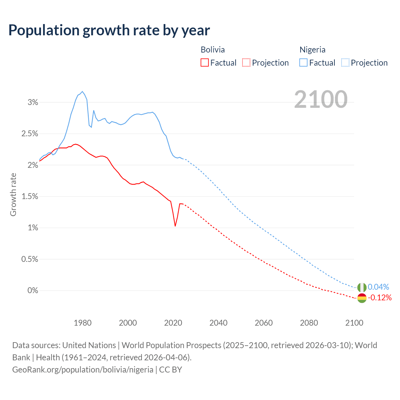 Data sources: World Bank | Health (1960–2024, retrieved 2026-04-06); United Nations | World Population Prospects (1960–2026, retrieved 2026-03-10); U.S. Census Bureau (1960–2025, retrieved 2026-02-08); Central Intelligence Agency (CIA) (2000–2019, retrieved 2026-02-20).
