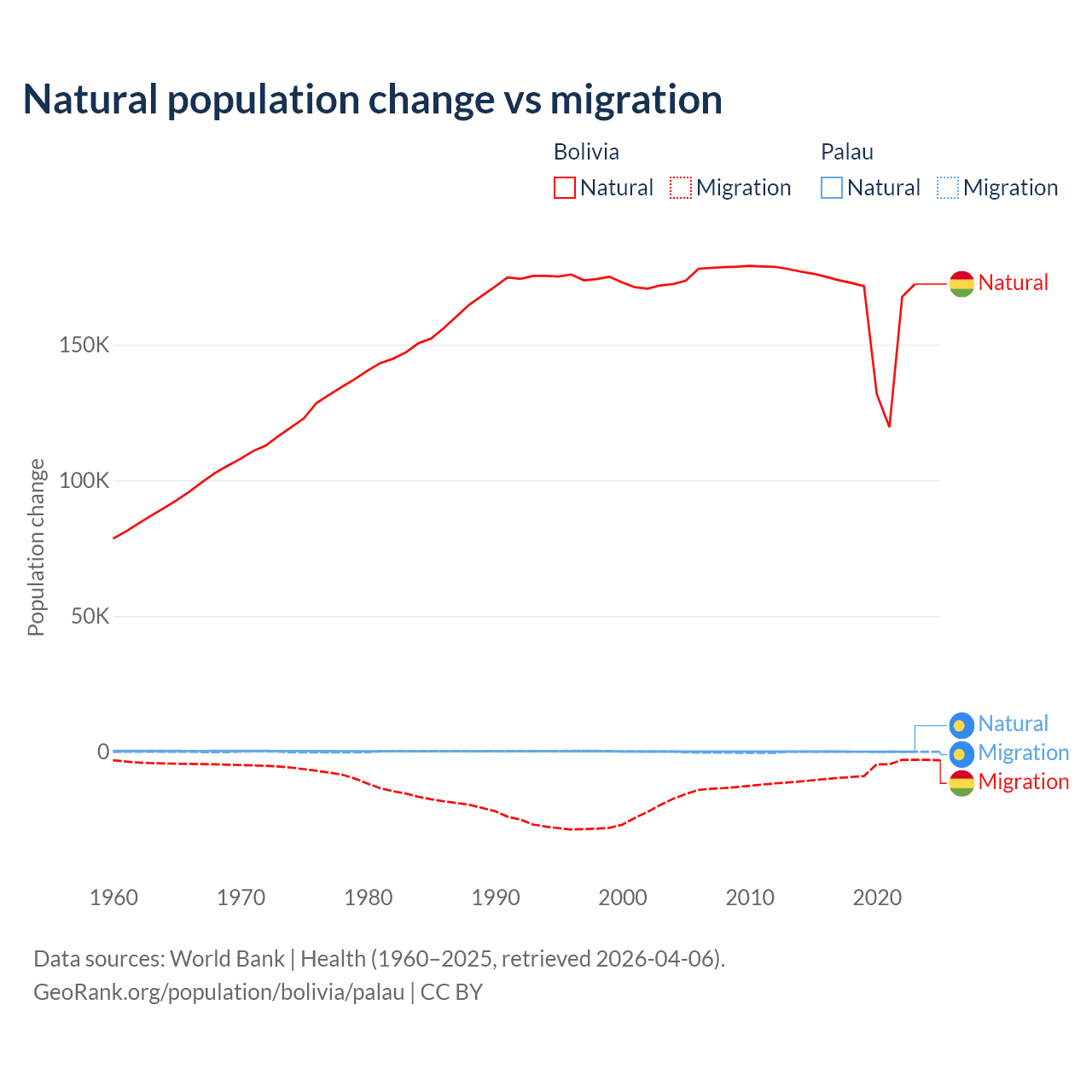 Over the last 10 years, 95.6% of the population change in Bolivia is from natural causes (a gain of 1,637,833 people) and 4.37% is from migration (a loss of 74,903 people). In Palau 53.8% is from natural causes (a gain of 264 people) and 46.2% is from migration (a loss of 227 people).