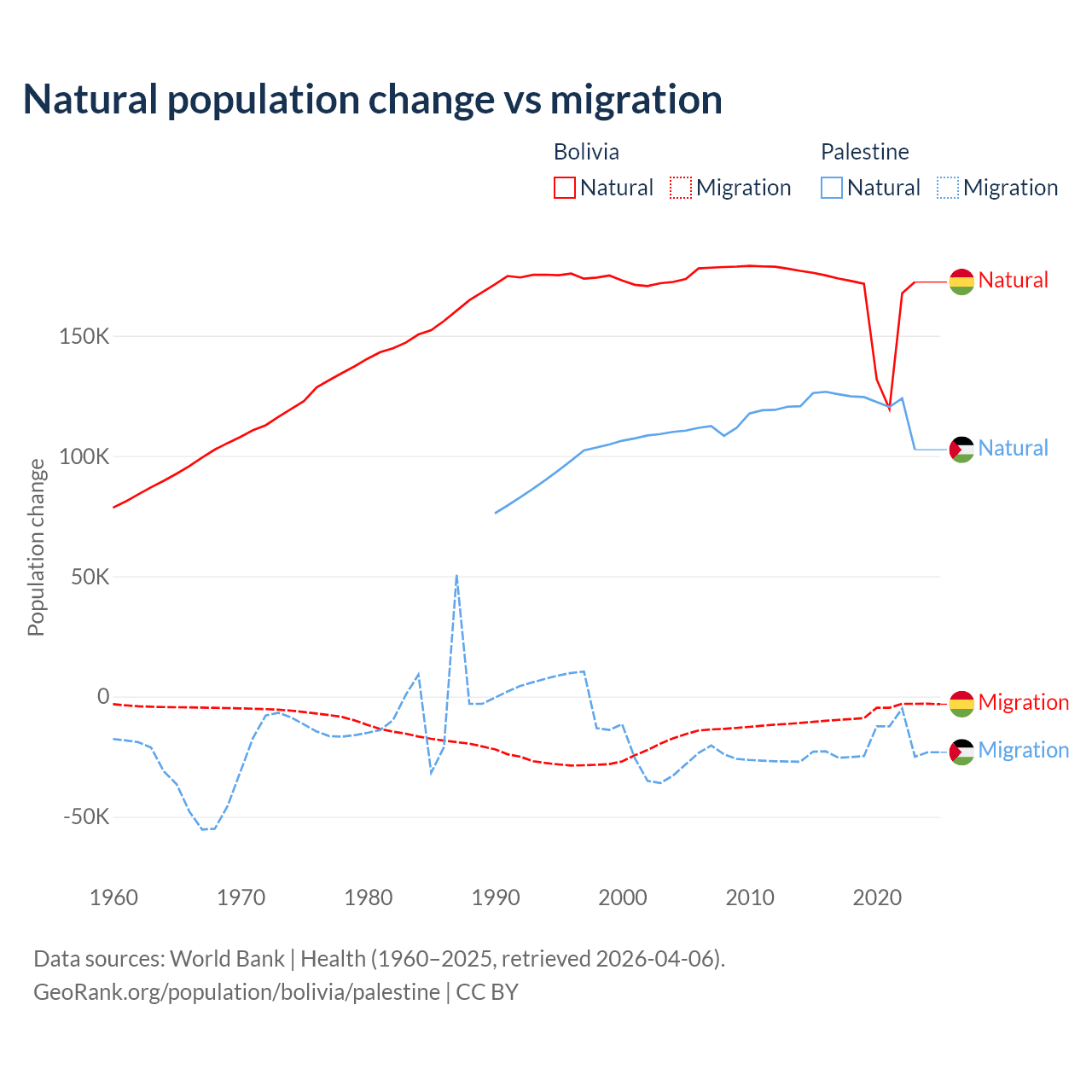 Over the last 10 years, 95.6% of the population change in Bolivia is from natural causes (a gain of 1,637,833 people) and 4.37% is from migration (a loss of 74,903 people). In Palestine 85.7% is from natural causes (a gain of 1,218,010 people) and 14.3% is from migration (a loss of 202,820 people).