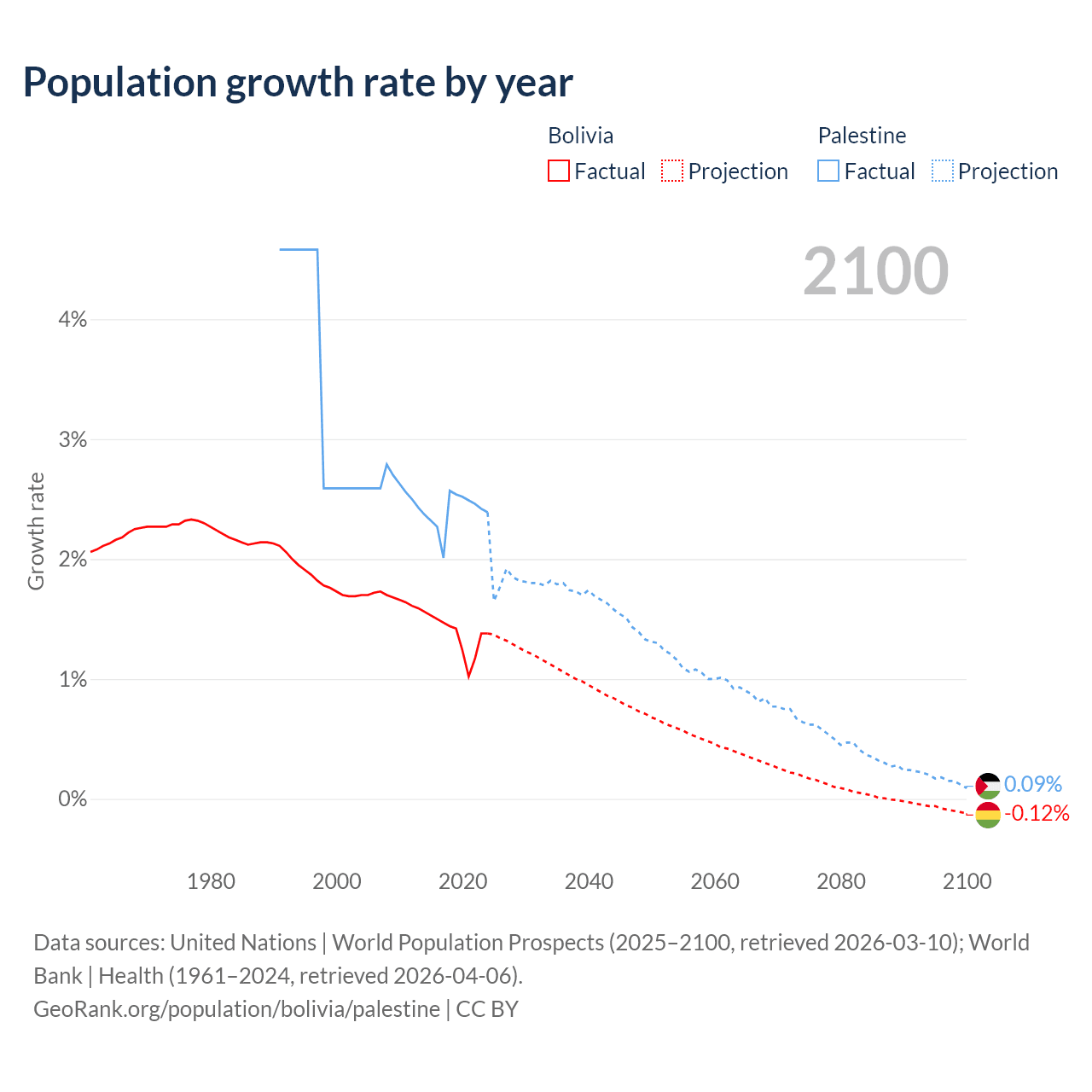 - For the last 10 years, Bolivia has had an average growth rate of +1.37% per year vs +2.4% in Palestine.