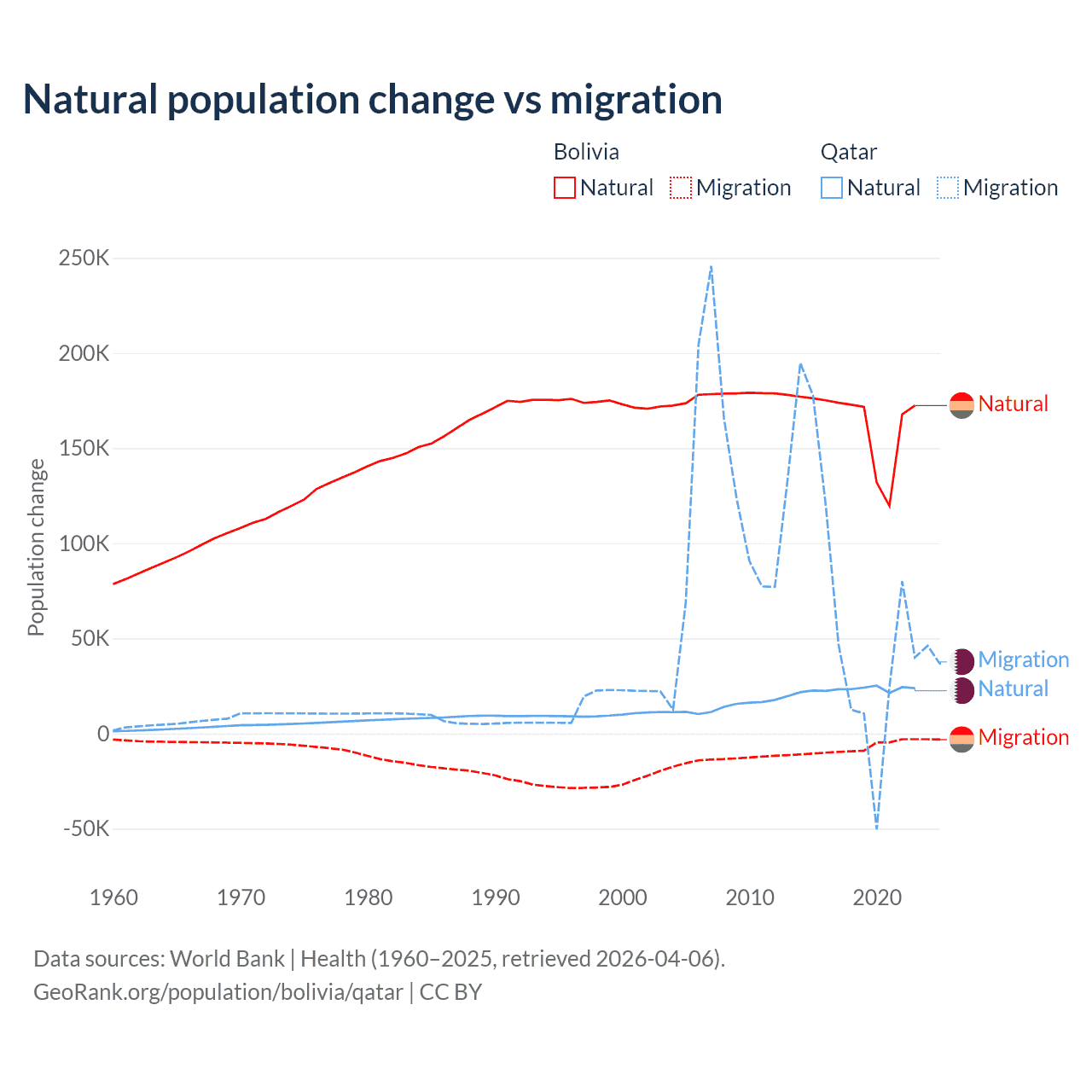 Over the last 10 years, 95.6% of the population change in Bolivia is from natural causes (a gain of 1,637,833 people) and 4.37% is from migration (a loss of 74,903 people). In Qatar 26.1% is from natural causes (a gain of 232,009 people) and 73.9% is from migration (a gain of 655,712 people).