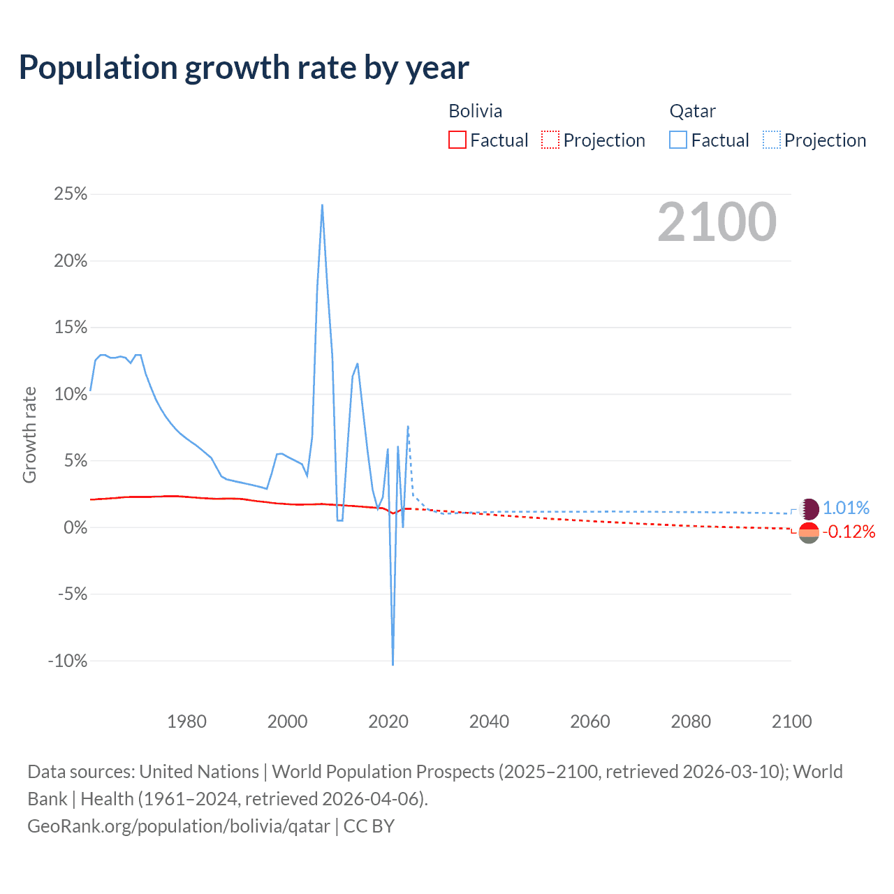 Data sources: World Bank | Health (1960–2024, retrieved 2026-04-06); United Nations | World Population Prospects (1960–2026, retrieved 2026-03-10); U.S. Census Bureau (1960–2025, retrieved 2026-02-08); Central Intelligence Agency (CIA) (2000–2019, retrieved 2026-02-20).